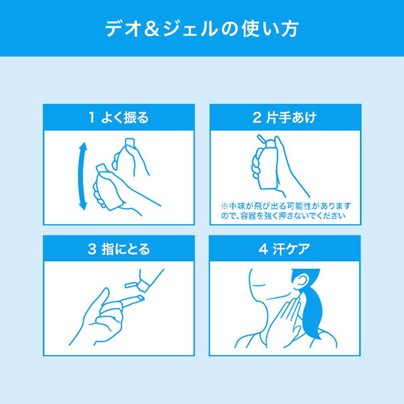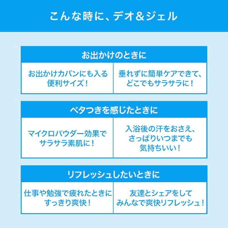 汗とニオイをおさえサラサラに保つ、制汗デオドラントジェル。垂れずにさらさらにケアできてどこでもサラサラに。爽快な使い心地。カバンに入る便利サイズ。