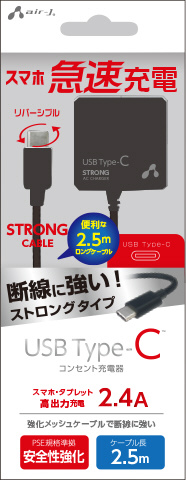 | 商品名 | [Type-C] 2.4Aタイプ 2.5m ケーブルACストロング充電器 BK AKJ-CTL24STG_BK |