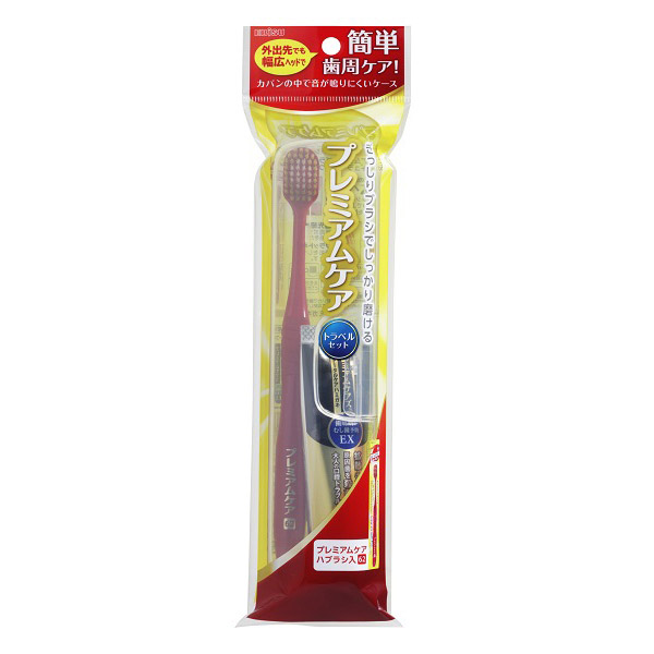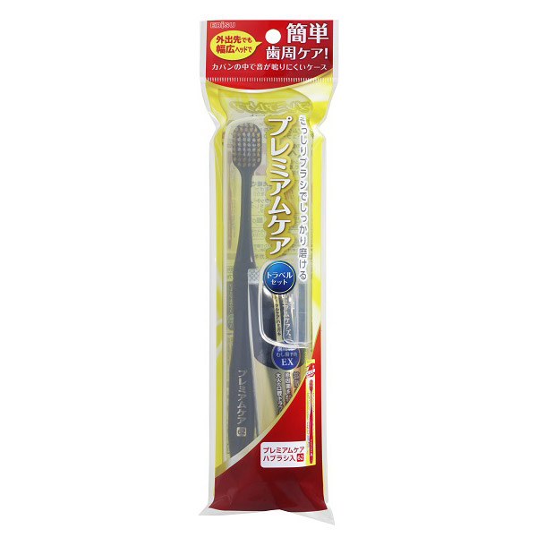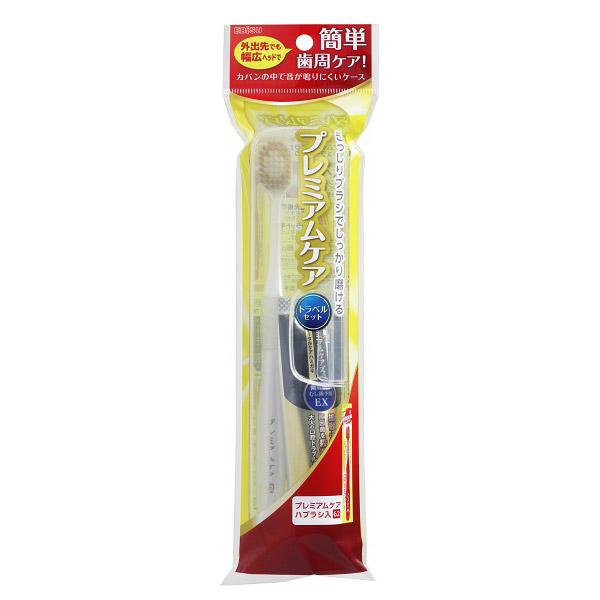 外出先でも幅広ヘッドで簡単に歯周ケアできるプレミアムケアのトラベルセット。「プレミアムケアハブラシ・6列レギュラーふつう」と大人の口腔トラブルを防ぐ薬用トータルケアハミガキ「プレミアムケアズ 歯周病とむし歯 予防EX 30g」入り。ハブラシとハミガキが固定でき、カバンの中で音が鳴りにくいケース。
