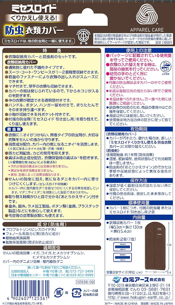 | 商品名 | ミセスロイド くりかえし使える防虫衣類カバー カバー1防虫2 |