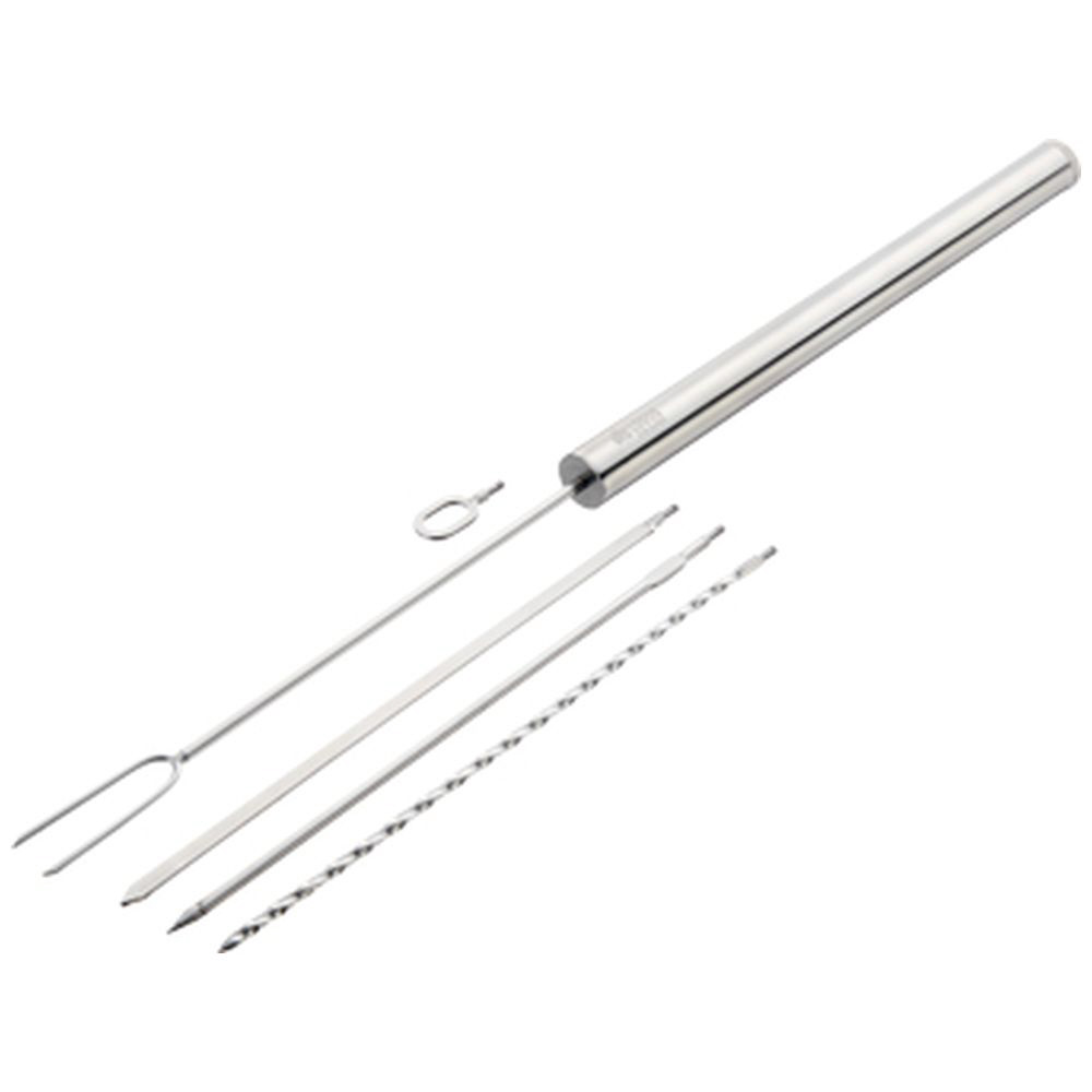 ・スキュア料理の達人アイテム・用途が異なる4本のスキュアを素材に合わせて付け替える・4本のスキュアはシリンダー内に収納、付属リングで吊り下げることもできます