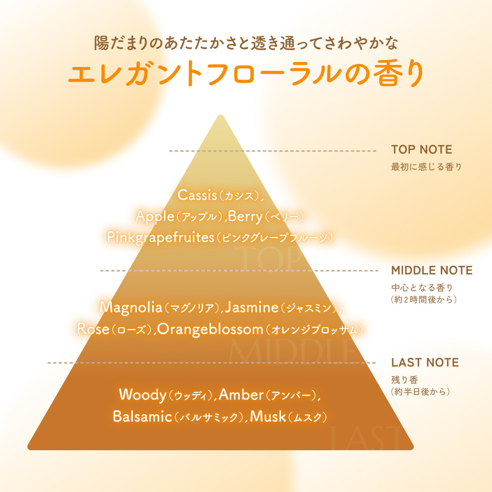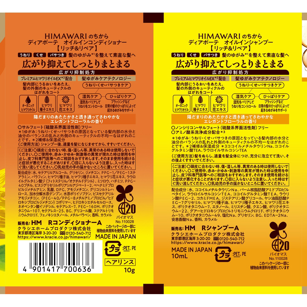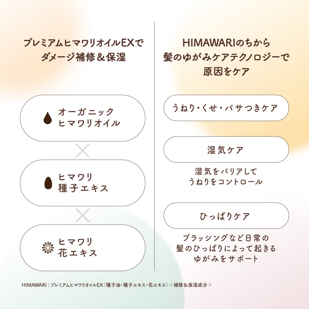 プレミアムヒマワリオイルEX配合(脂質&水分キープ+ダメージ補修+広がり抑制成分)。うねり・くせ・パサつきの原因である「髪のゆがみ」を整え、広がりを抑えてしっとりまとまるな髪へ。「ゆがみケアシステム」採用。うねりを目立たなくする「うねりコントロール処方」。傷んだ部分をねらって集中捕集する「ダメージセンサー機能」。陽だまりのあたたかさと透明感のある心地よいエレガントフローラルの香り。