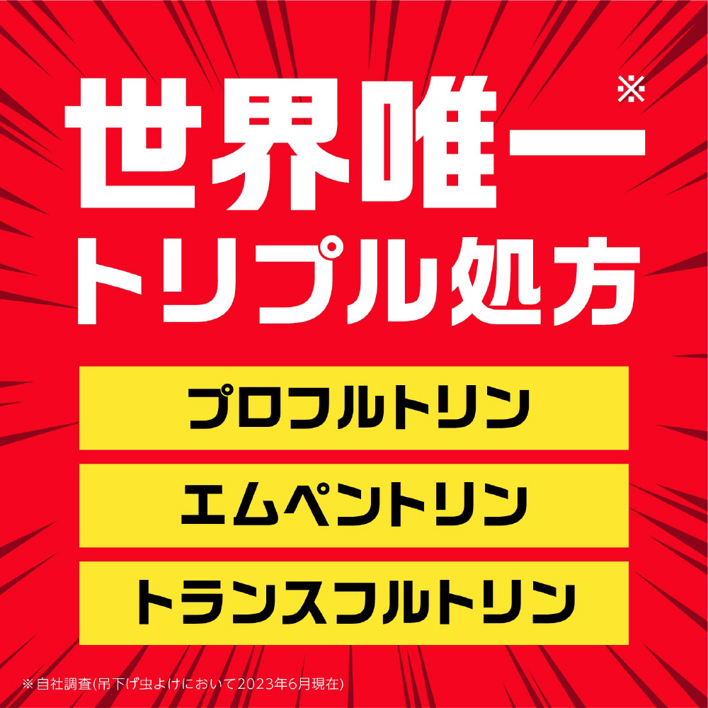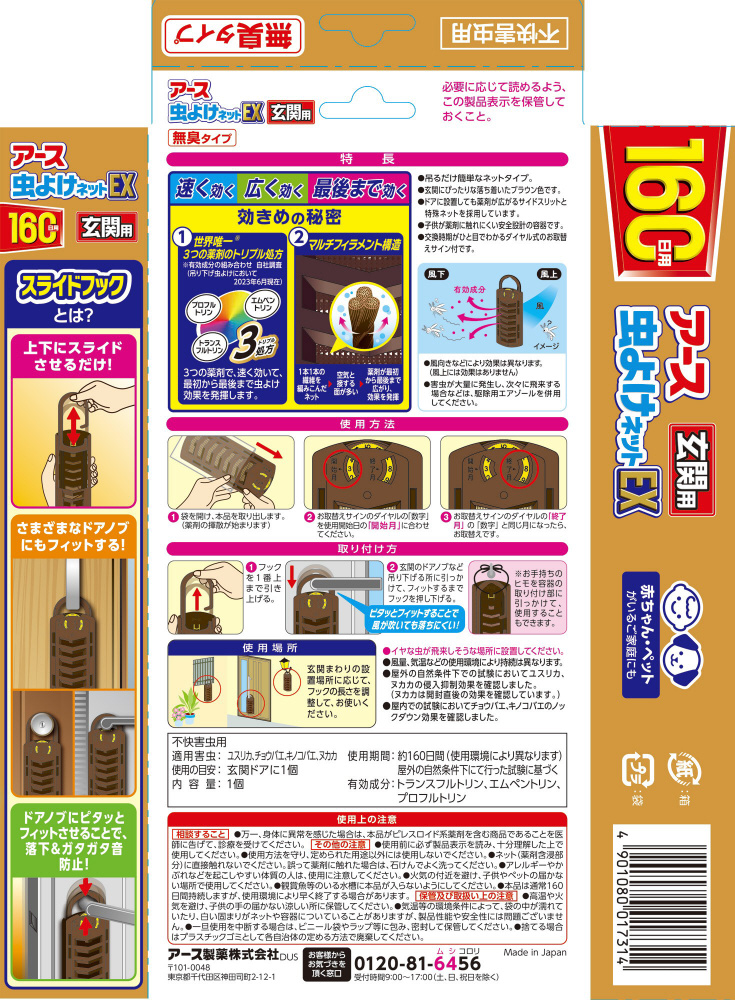 玄関につるだけ簡単なネットタイプの虫よけです。3つの薬剤で、速く効いて、最初から最後まで虫よけの効果を発揮します。お取替えサイン付です。※HD函仕様です。