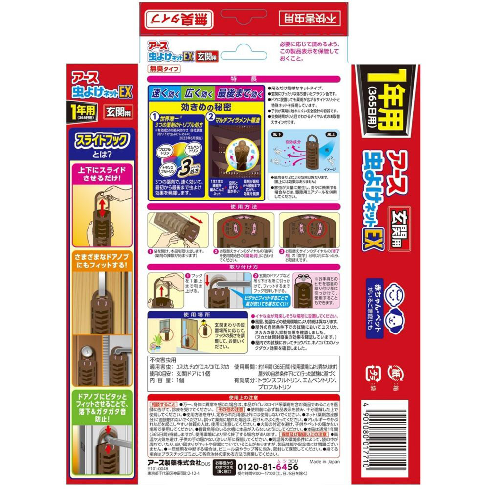玄関につるだけ簡単なネットタイプの虫よけです。3つの薬剤で、速く効いて、最初から最後まで虫よけの効果を発揮します。お取替えサイン付です。※HD函仕様です。