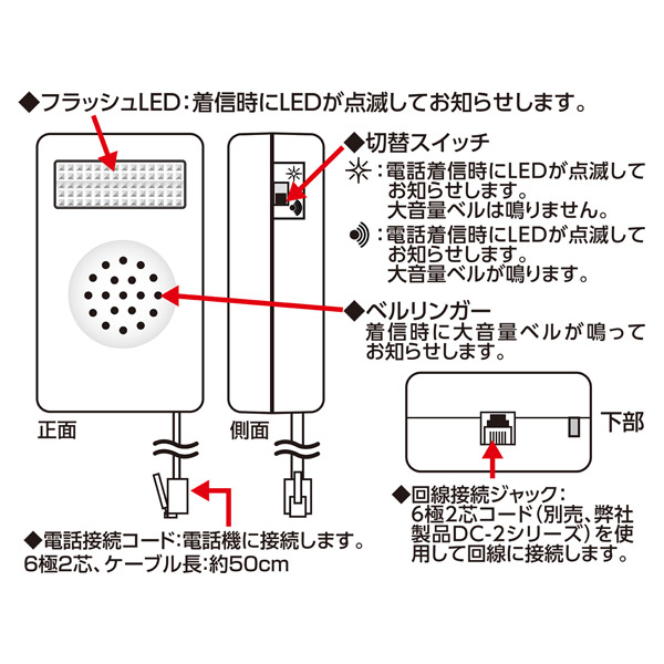 ◆電話機に接続して、発光とベル音で着信をお知らせするフラッシュリンガー
