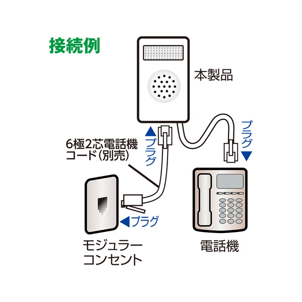 ・電話機に接続することで、着信があった際にベル音と白色LEDでおしらせできます。音が聞こえにくい環境などに最適です。