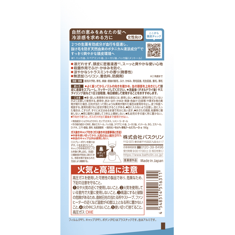 生薬有効成分が角層まで浸透、血行を促進し、抜け毛予防&育毛。天然由来のボタニカル清涼成分(ハッカ油、スペアミント油、ユーカリ油、ハッカ脳メントール)でいやされる大人の冷涼感。すっきり爽やかな頭皮環境へ(女性向け)●液だれせず、頭皮に密着浸透●殺菌作用でふけ、かゆみを防ぐ。●無添加(シリコン、着色料、防腐剤)●涼やかなシトラスミントの香り(微香性)