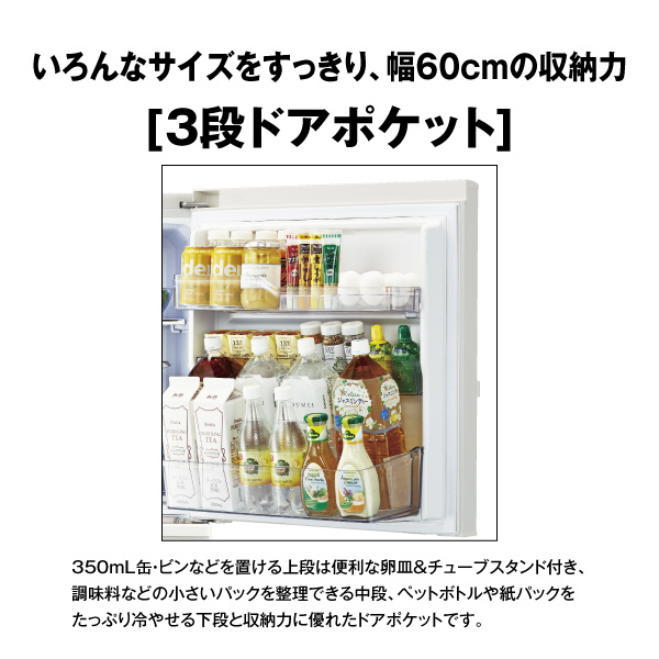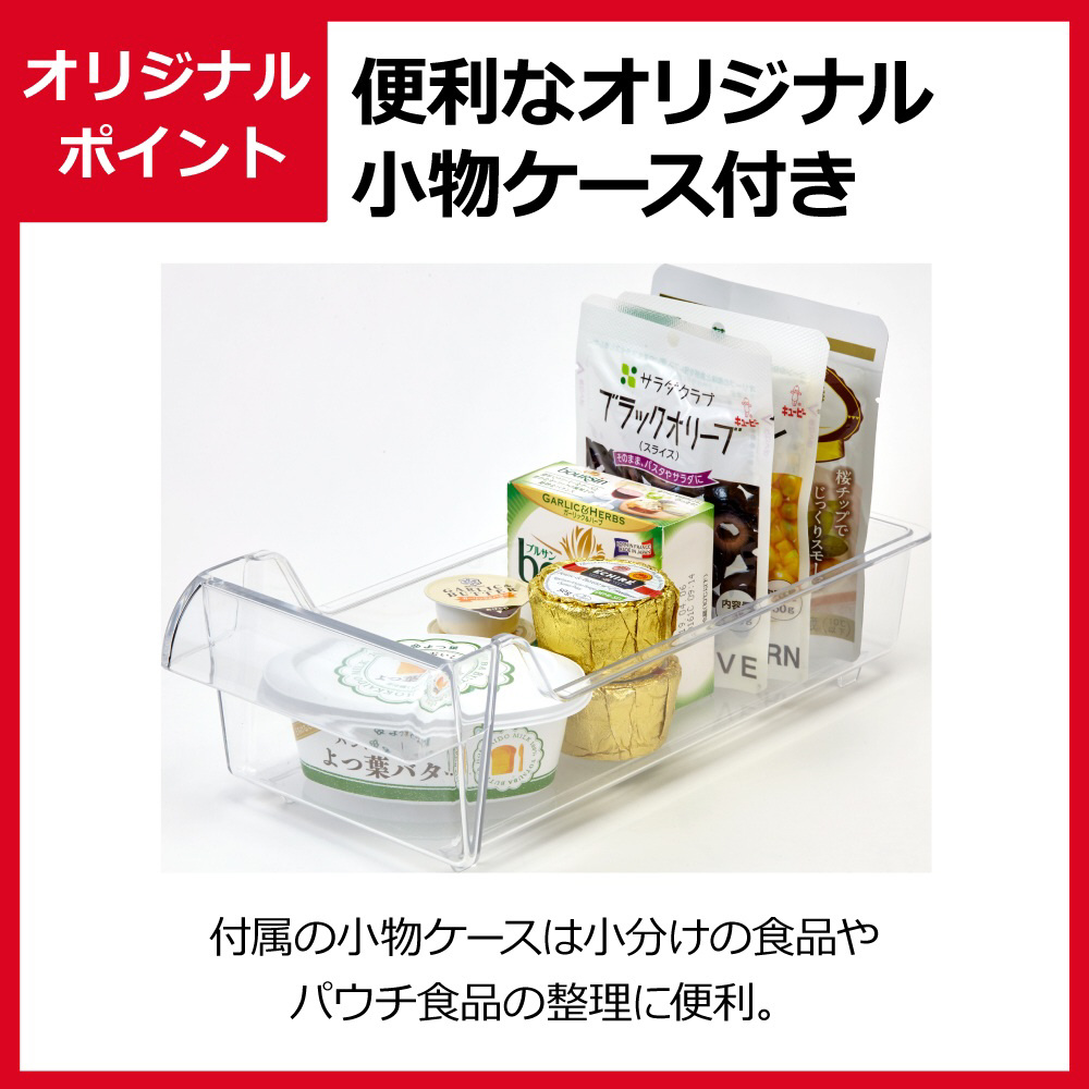 | 付属品 | [冷蔵室]ガラストレイ、チルドケース、給水タンク、ワイドマルチポケット、卵皿&チューブスタンド、ミニボトルポケット、ボトル&ドレッシングポケット、[冷凍室]冷凍ケース、貯水コーナー、製氷ユニット、氷スコップ、防音マット、[野菜室]野菜ケース、バスケット、[その他]蒸発皿 |