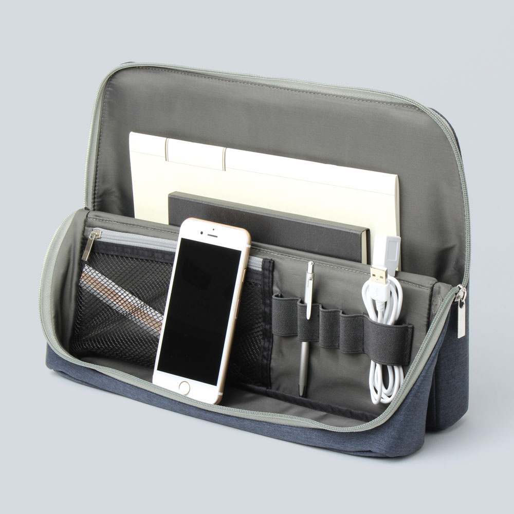 マグネットでピタッと安定。あっと言う間にすっきりスタンド!自立補助フラップで後ろに倒れにくい。A4ノート、12インチタブレット、USBケーブル、などを収納。ちょい置きトレーには、スマートフォンを立て掛けることができる。スマートフォン周辺機器を、スッキリ持ち運べます。フリーアドレスにも最適。