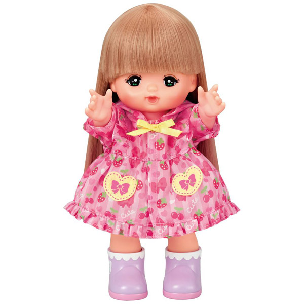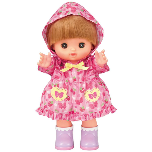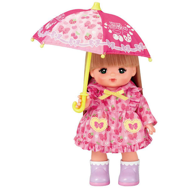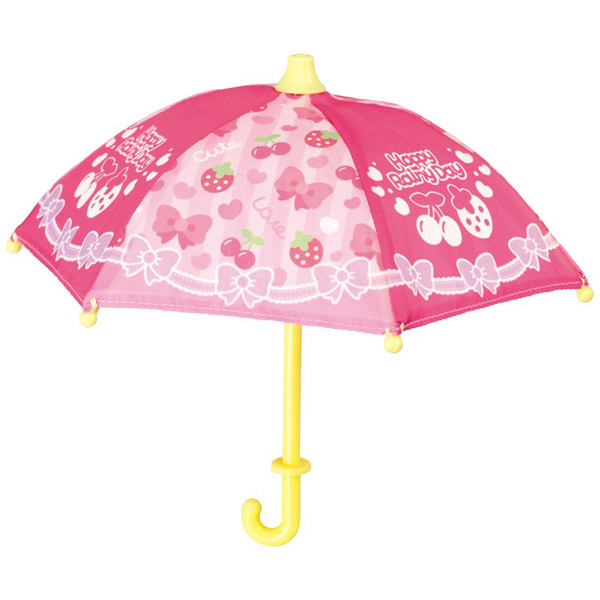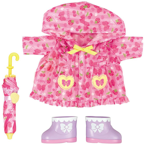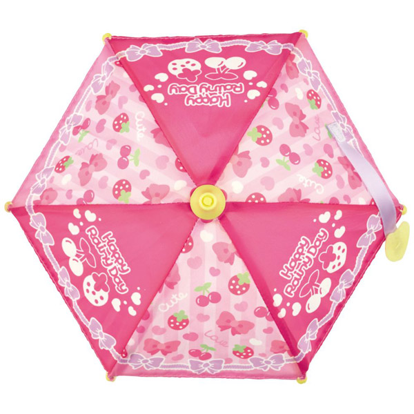 いちごとさくらんぼ、リボン柄のピンクのレインコートとかさのセットです。
