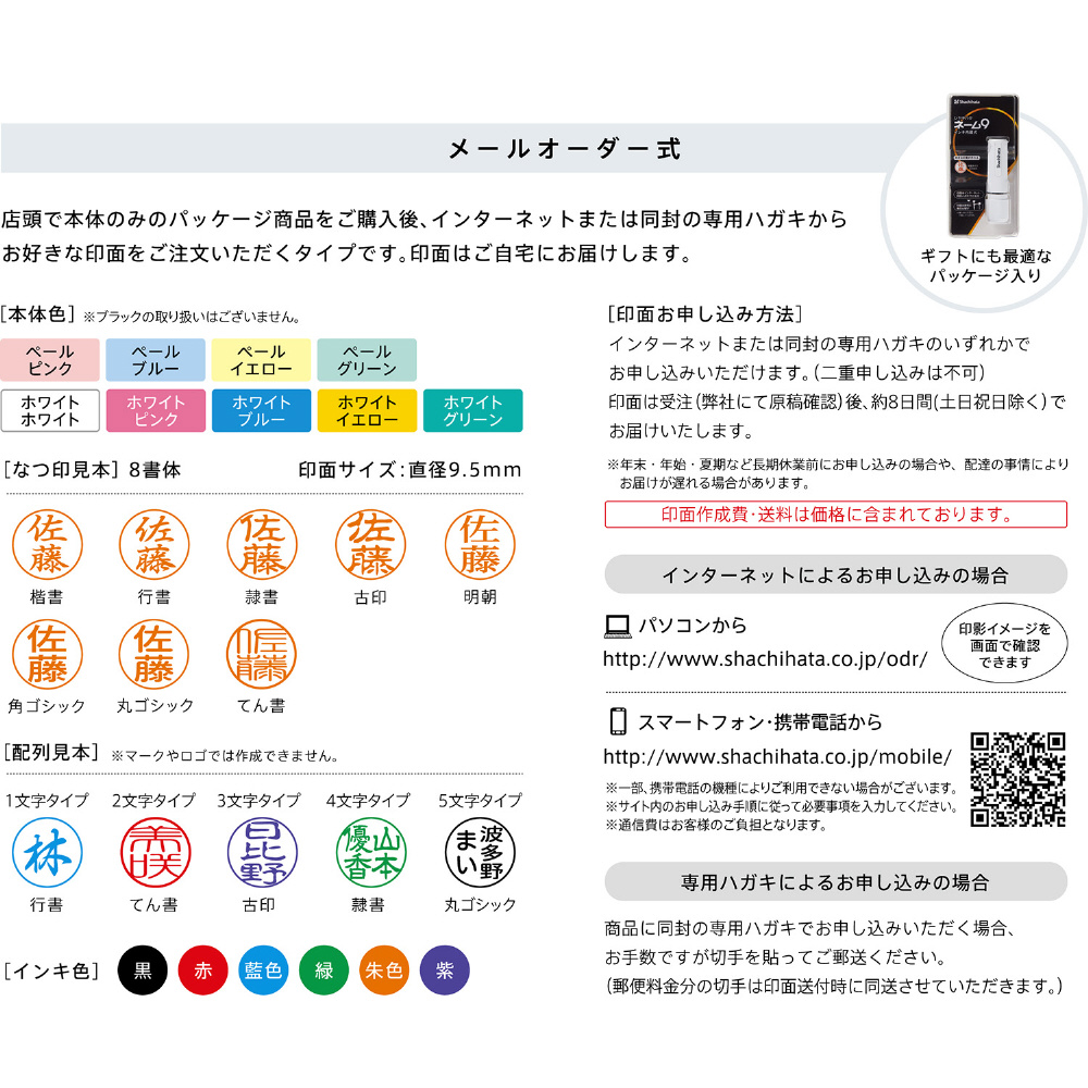 メールオーダー式とは、商品をご購入後、インターネットまたは同封の専用ハガキから印面部分をご注文頂けます。8書体・インキ色6色よりお好みの印影を作成頂けます。