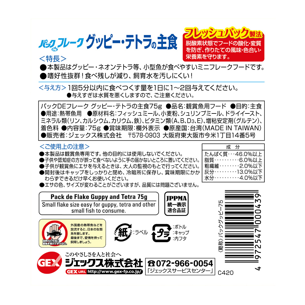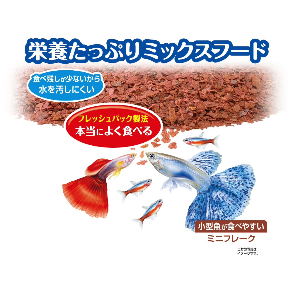 嗜好性抜群!、グッピー・ネオンテトラ等、小型の魚専用のフレーク飼料です。小型の魚が食べやすい小さな形状、小型の魚が一口で効率よく必要な栄養素を取り入れられます。 フレッシュパック採用により、脱酸素状態でフードの酸化・変質を防ぎ、作りたての風味・色あい・栄養素を守ります。