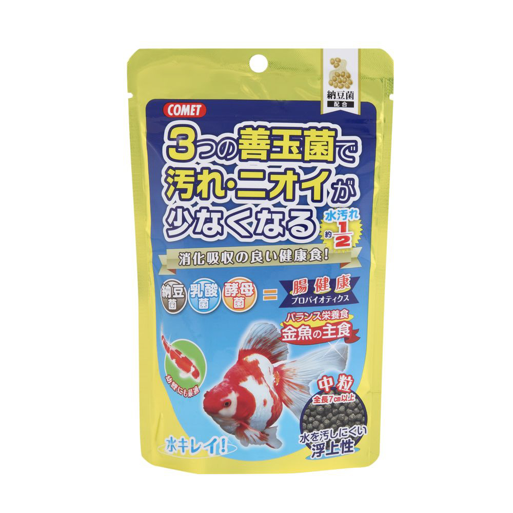 納豆菌に加え、新たに乳酸菌と酵母菌を配合。この3つの善玉菌の力で金魚の腸内細菌のバランスを整え、水の汚れや嫌なニオイを減らします。健康に育つビタミン配合のバランスフードで、浮上性の中粒です。