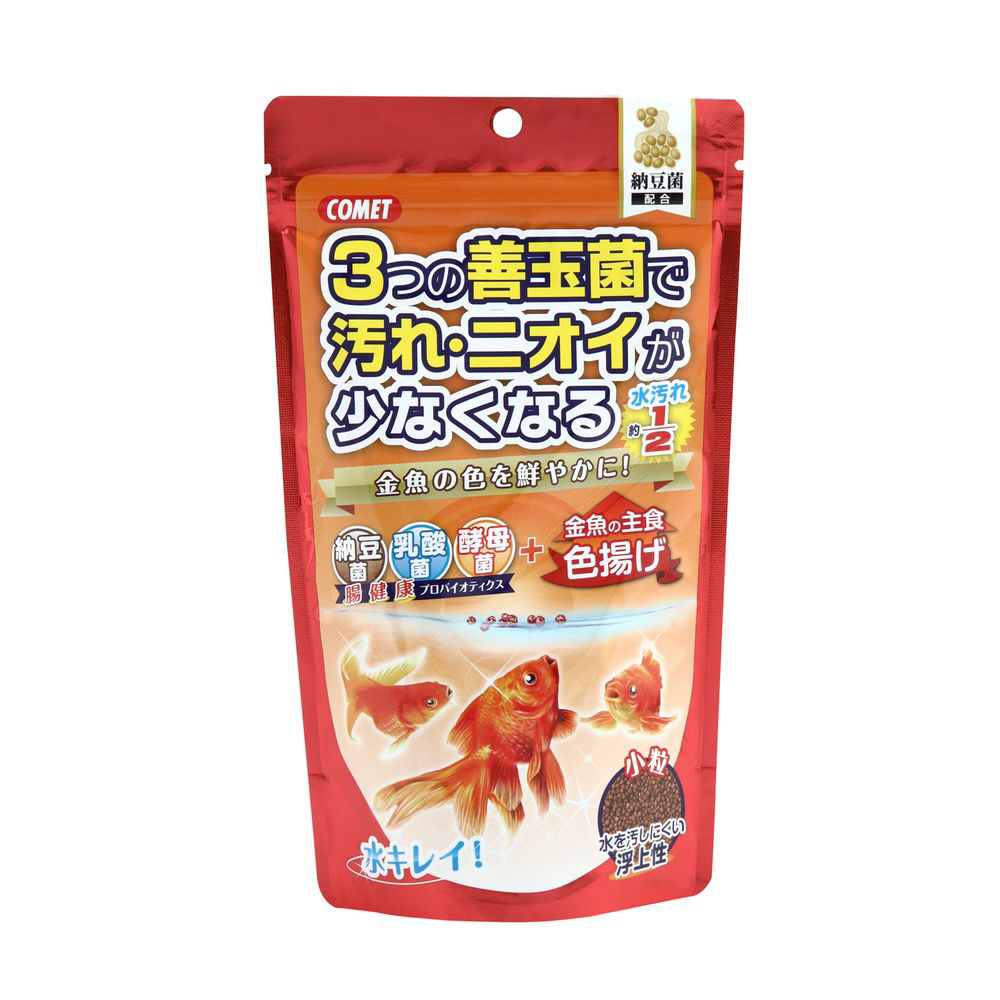 納豆菌に加え、新たに乳酸菌と酵母菌を配合。この3つの善玉菌の力で金魚の腸内細菌のバランスを整え、水の汚れや嫌なニオイを減らします。更に金魚の色を鮮やかにするカロチノイド配合の色揚げ用栄養フード。小粒タイプ。