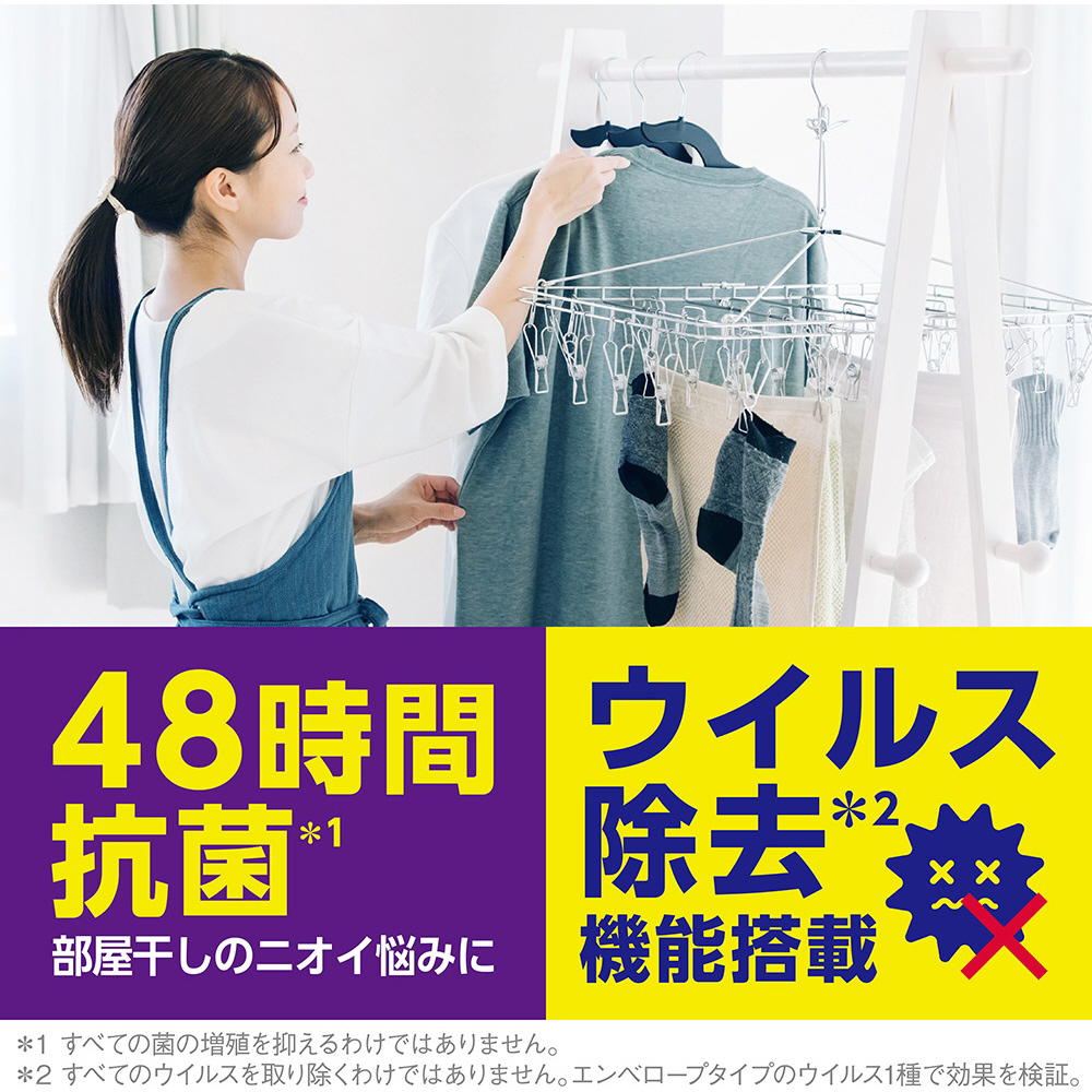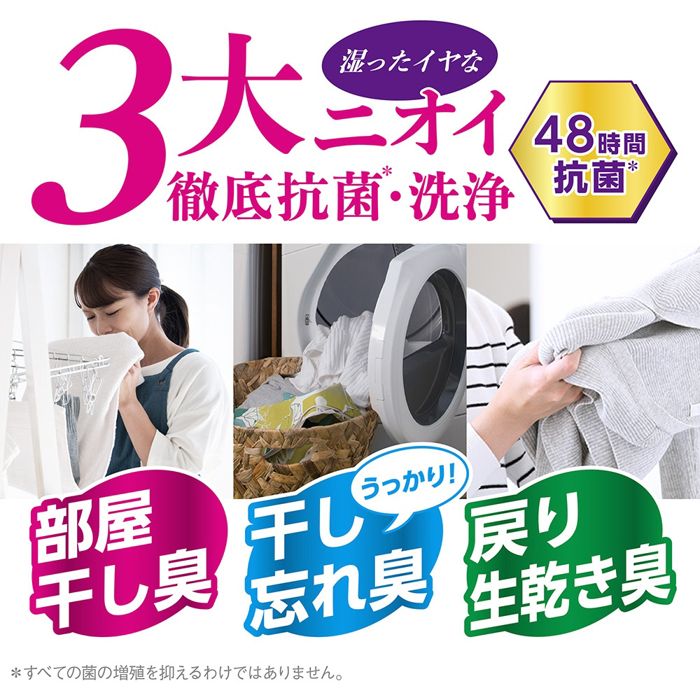 24時間抗菌で、菌による三大ニオイ悩みを撃破します。1)部屋干し臭、2)干し忘れ臭、3)戻り生乾き臭、をしっかり防いで気持ちよく洗える液体洗剤です。・24時間抗菌だから、お洗濯まわりの三大ニオイ悩みをまとめて解消。・液がさらさらだから、液切れが良くキャップの液残りがない上に、洗濯機の洗剤投入口に残りにくい。・微香性だから、柔軟剤の香りを邪魔しない。・すすぎ1回対応。
