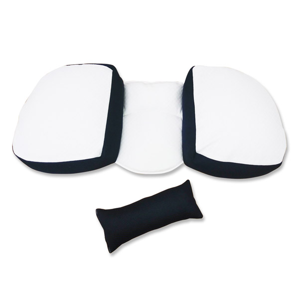 は仰向けの時は枕を使わない状態、横向きになったときは枕を使用して首や肩への負担が最も少ない睡眠環境を演出する独特の形状を持った枕。