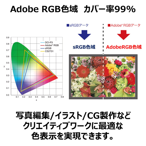 ColorEdge CS2731 はWQHD(2560×1440)解像度を持つ、Adobe RGB 色域を99%カバーしたIPS 方式パネルを採用した27.0 型液晶モニターで、CS2730 の後継機種です。