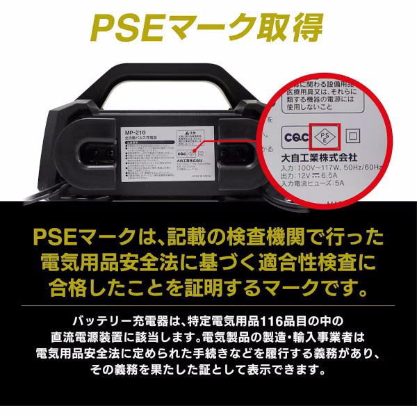 MP-210 全自動パルスバッテリー充電器 (バイク−普通自動車・小型農機) 12V専用 定格6.5A バッテリー診断機能付