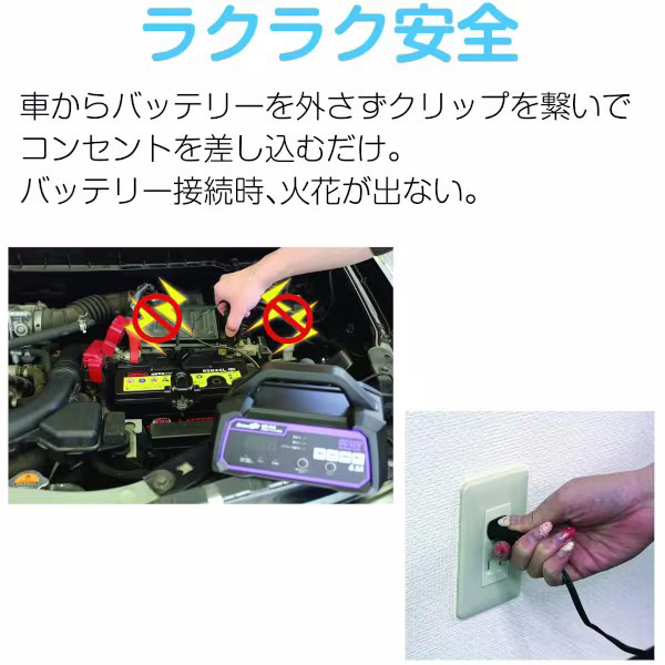 ●車のバッテリーを外さず繋いでコンセントを差し込むだけで誰にでも簡単充電