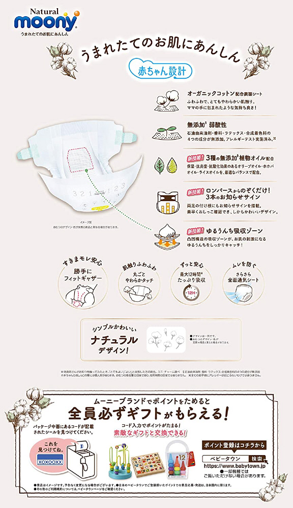 表面シートにオーガニックコットンを配合しやわらかい肌触りを実現。「無添加」&「弱酸性」仕様のシートに、新技術「ゆるうんち吸収ゾーン」が、ゆるうんちの肌残りを大幅低減。さらに3種の天然無添加オイル配合でさらにお肌にやさしくなりました。3本のデザインジケーター搭載で交換時期がよりわかりやすくなりました。ナチュラルなやさしさで、カブレやすいお肌にも安心です。