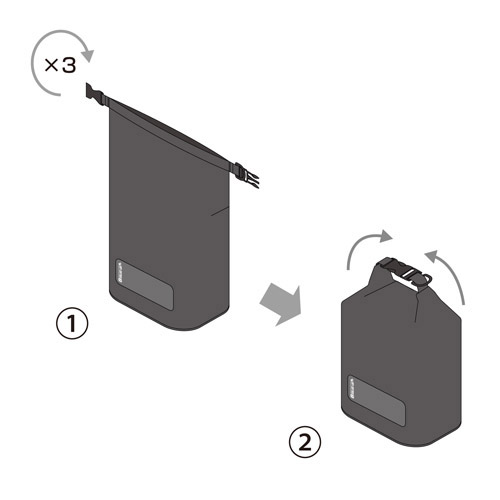 防水バッグのように入口を巻いて閉じる構造で、密閉性に優れています。