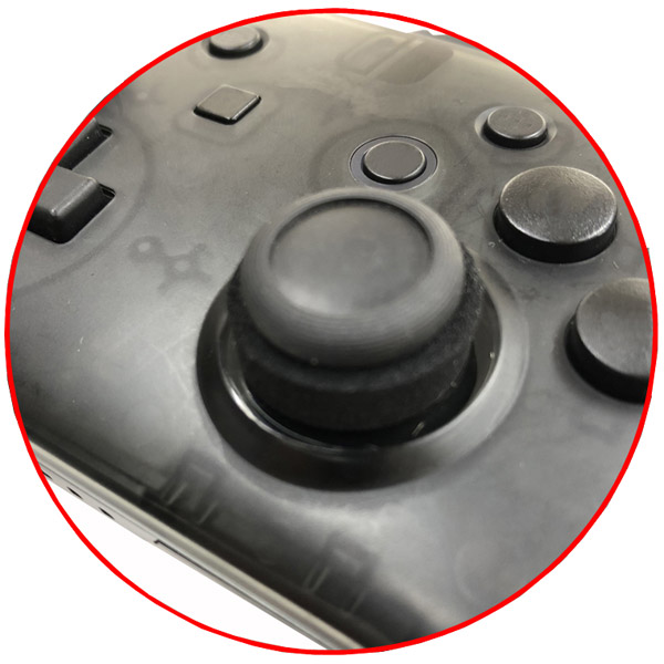 商品の性格上、スポンジを押し込んでも、スティックで入力出来ない部分が出てくるのは仕方が無い。倒しすぎないような力加減が出来るだけで、逆に言えば素早く対応したいときには、スティックが最大限に倒せないので邪魔でしか無い。