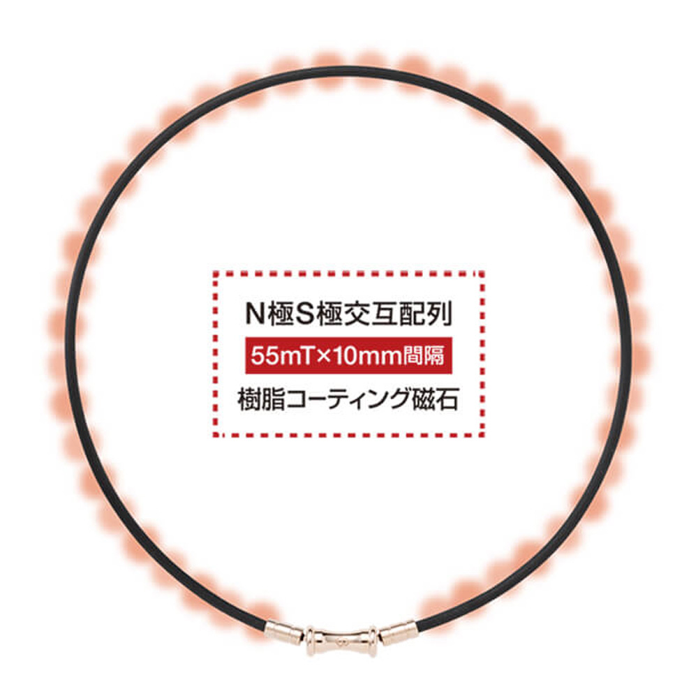 ネックループ全体には55mTの磁石がコラントッテ独自のN極S極交互配列で10mm間隔に配置されています。この配列により磁力を広範囲に影響させることができ、首・肩の血行を改善、首・肩のコリを緩和します。コラントッテ TAO ネックレス スリム RAFFI miniは首全体の血行を改善、コリに効く磁気ネックレスです。