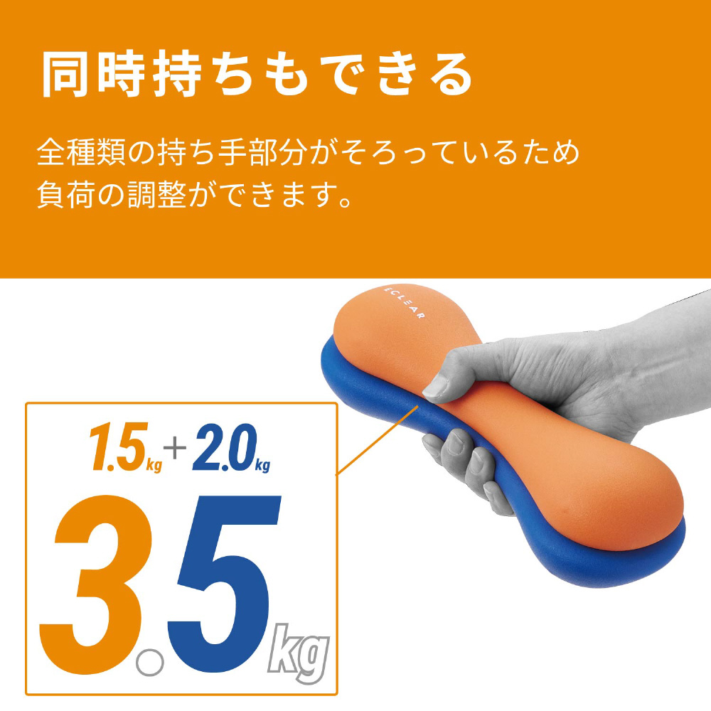 同じ重さでも異なる重さでも、2個を重ね持ちでき、重さの調節が可能です。※本製品は1個入りです。