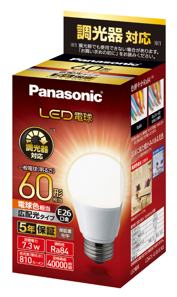 | 仕様1 | ◆調光器対応タイプに明るさ60形相当が新登場◆配光角約180度「広範囲を明るく照らす」◆白熱灯用からLED用まで様々な調光器に対応 |