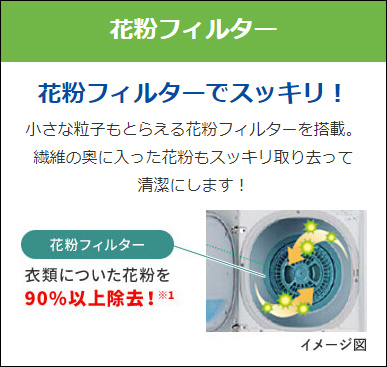 衣類に付着した花粉を除去!花粉のような小さい粒子もとらえる、花粉フィルターを搭載しました。繊維の奥に入った花粉もスッキリ取り去って清潔にします。