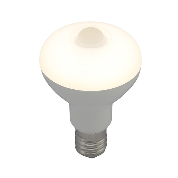 人が近づくと自動点灯、人感・明暗センサー機能付きLEDレフ電球です。「LED電球 レフランプ形 E17 40形相当 人感・明暗センサー付」