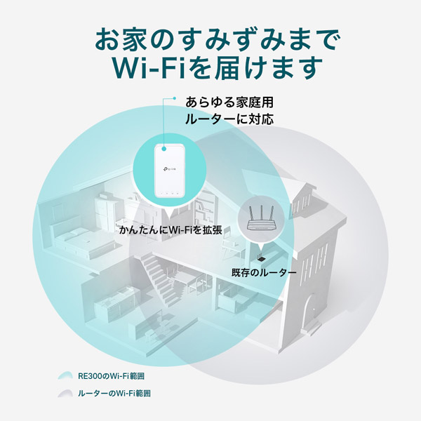 RE300/Rは一般的なあらゆるWi-Fiルーターと互換性がありますので、お持ちのWi-Fiルーターに接続するだけでお手軽にWi-Fi範囲の拡張ができます。