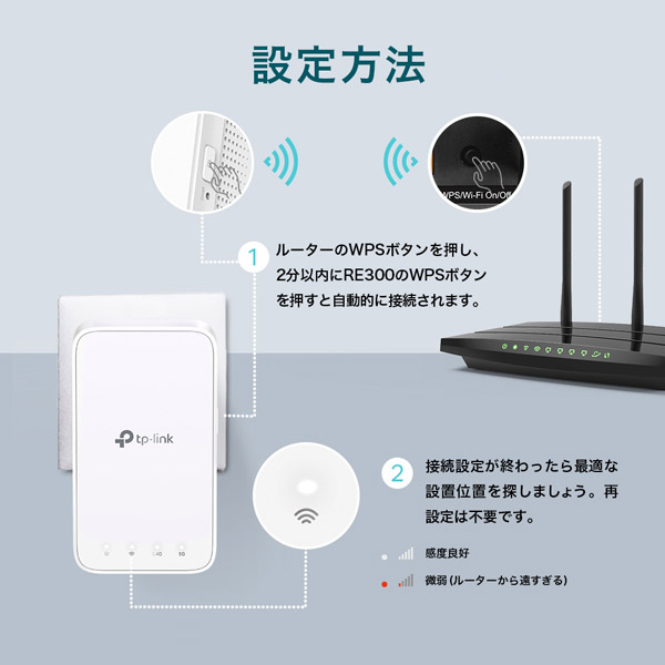 ボタンを押してWi-Fiルーターとの設定完了。 WPSボタンで簡単にWi-Fiルーターと接続・設定することが可能です。シグナルインジケータ(LEDランプ)を見れば、ひと目で適切な設置位置を探すことができます。