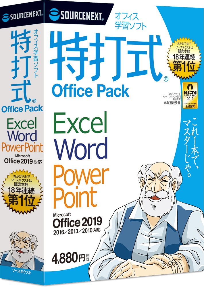 定番のOffice学習ソフトがOffice2019対応で新登場!「お手軽ムービーを見る」→「実際に操作する」→「判定」の3ステップで学習するので、本ではわかりにくい操作も簡単に習得できます。「特打式OfficePack」では、Excel・Word・PowerPointが学べます。※2018年1月〜2018年12月 トレーニングソフト部門 BCN調べ