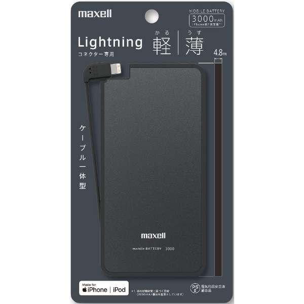 MPC-RTL3000PBK モバイルバッテリー Lightningコネクタ一体型 ブラック [3000mAh /1ポート /充電タイプ]