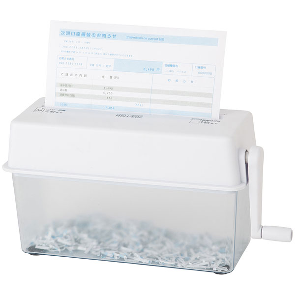 ・最大細断枚数:紙/2枚(A4コピー用紙64g/平方メートル縦二つ折り)。郵便はがき/1枚(厚み0.2mmまで)。