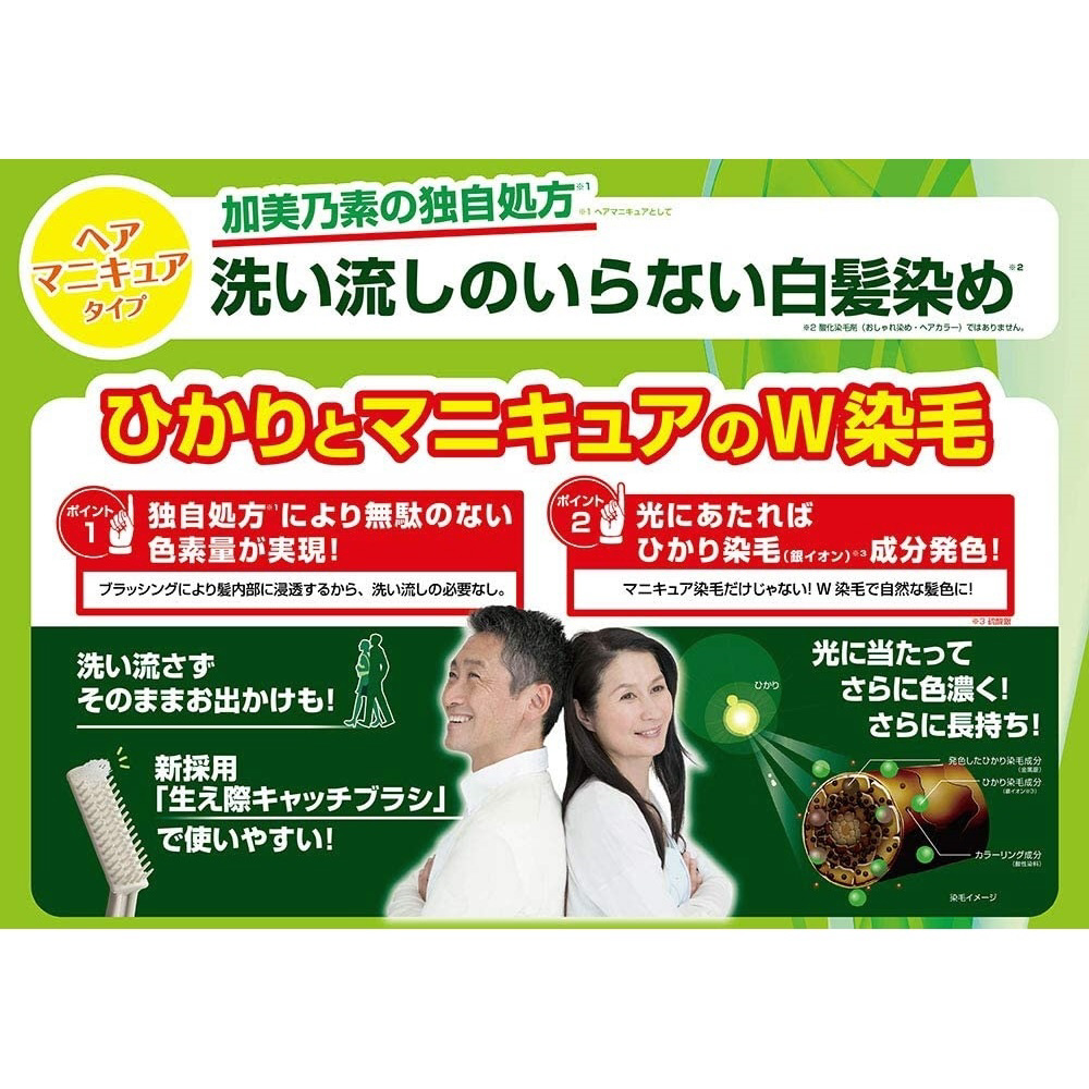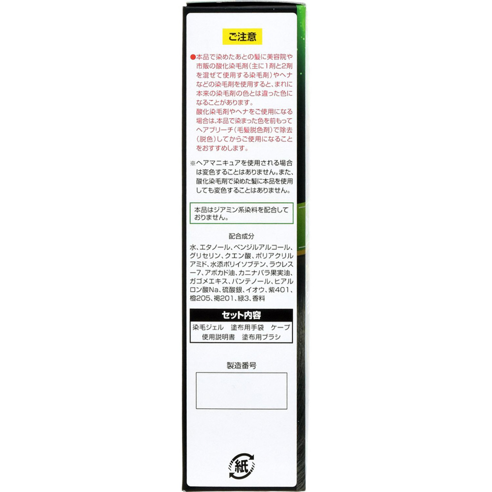 洗髪不要のジェルタイプの白髪用ヘアマニキュア。ひかり染毛とヘアマニキュアのW染毛効果で白髪をより自然な色合いに染め上げ、髪色を長持ちさせます。全体染めはもちろん、新採用の生え際キャッチブラシで部分染めとしても使用できます。髪をいたわる2種のボタニカルオイル(アボカド油、カニナバラ果実油)を含む5種のトリートメント成分がハリとツヤのある髪へ。フローラル調でツンとしない香り。