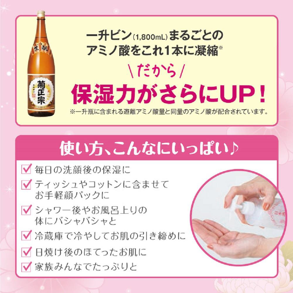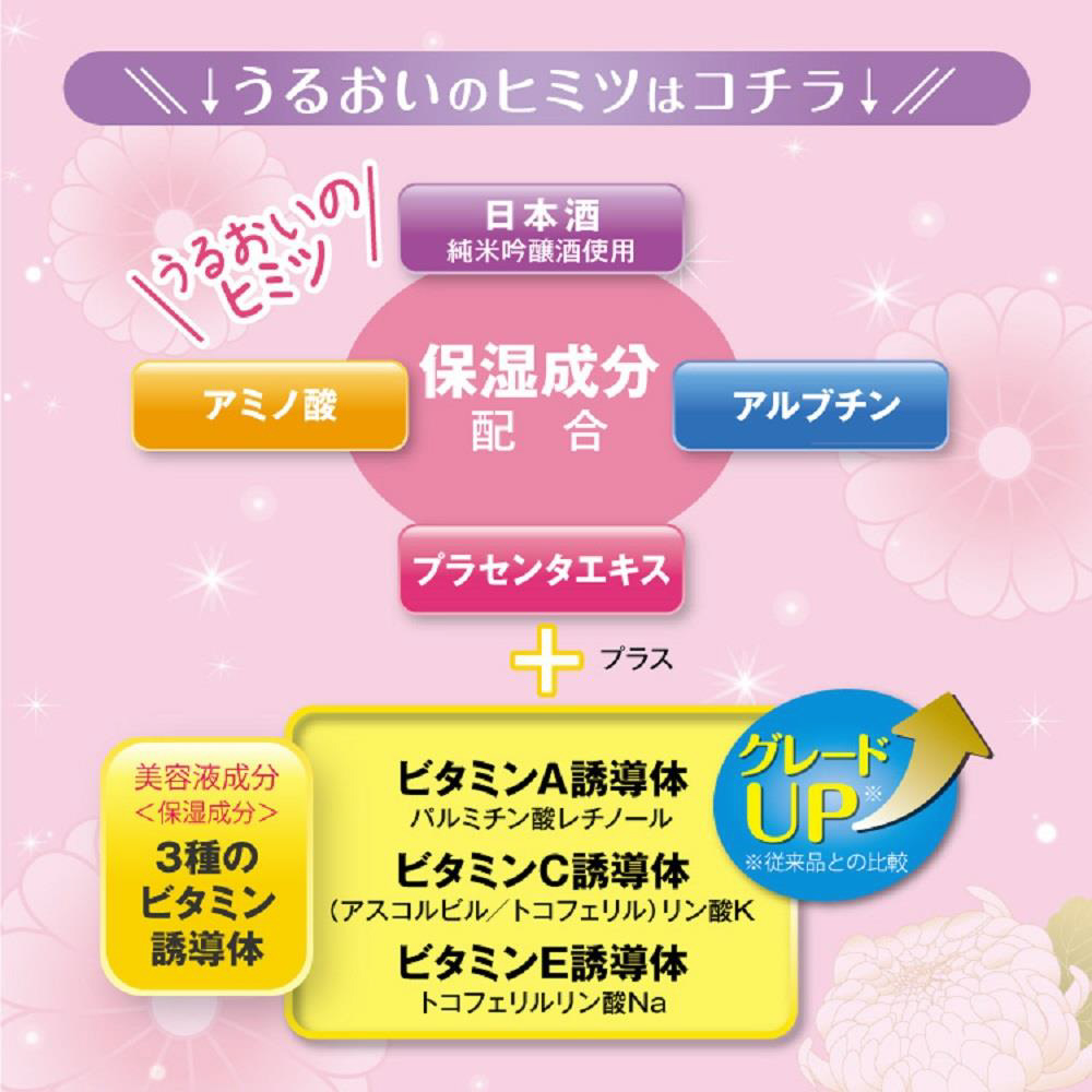 うるおいを与えて肌の状態を整える、日本酒※(コメ発酵液・保湿成分)配合の化粧水です。保湿効果の高い3種のアミノ酸と3種ビタミン誘導体をさらにプラスしました。かさつきや乾燥が気になる部分にすーっとなじみ、肌荒れのないしっとりみずみずしい素肌に導きます。コットンでフェイスパックするのもおすすめです。顔はもちろん、全身にもたっぷりお使いいただけます。