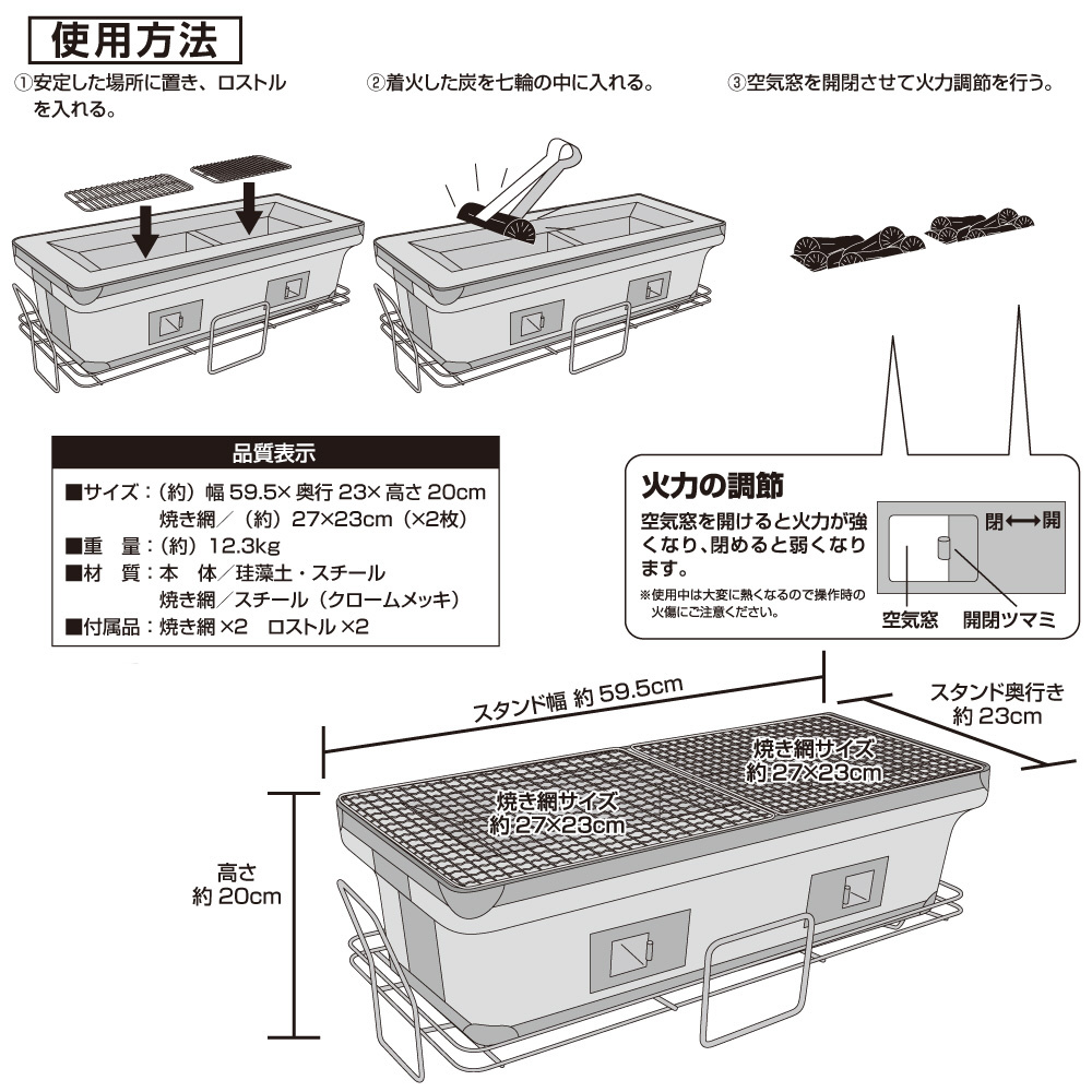 ロングサイズの長角型七輪。みんなで炭火焼を楽しめます!