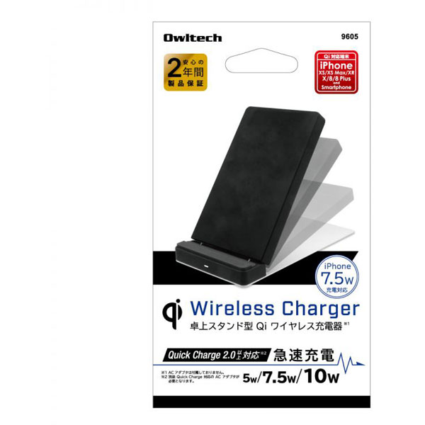 | 商品名 | 卓上スタンド型 Qiワイヤレス充電器 Quick Charge 2.0対応 最大10Wで急速充電 OWL-QI10W04-BK ブラック 【864】 |