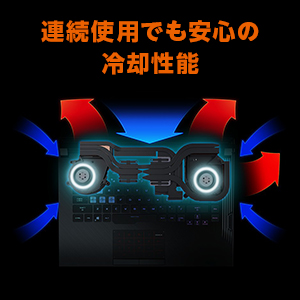 2つのファンで冷却を行うデュアルファン冷却システムを搭載。ヒンジカバーにも通気口を設けることで、強力なエアフローを実現しています。ダストホールも搭載しており、埃による冷却性能の低下も心配ありません。