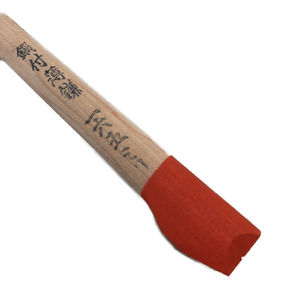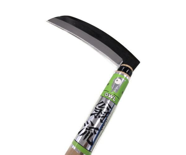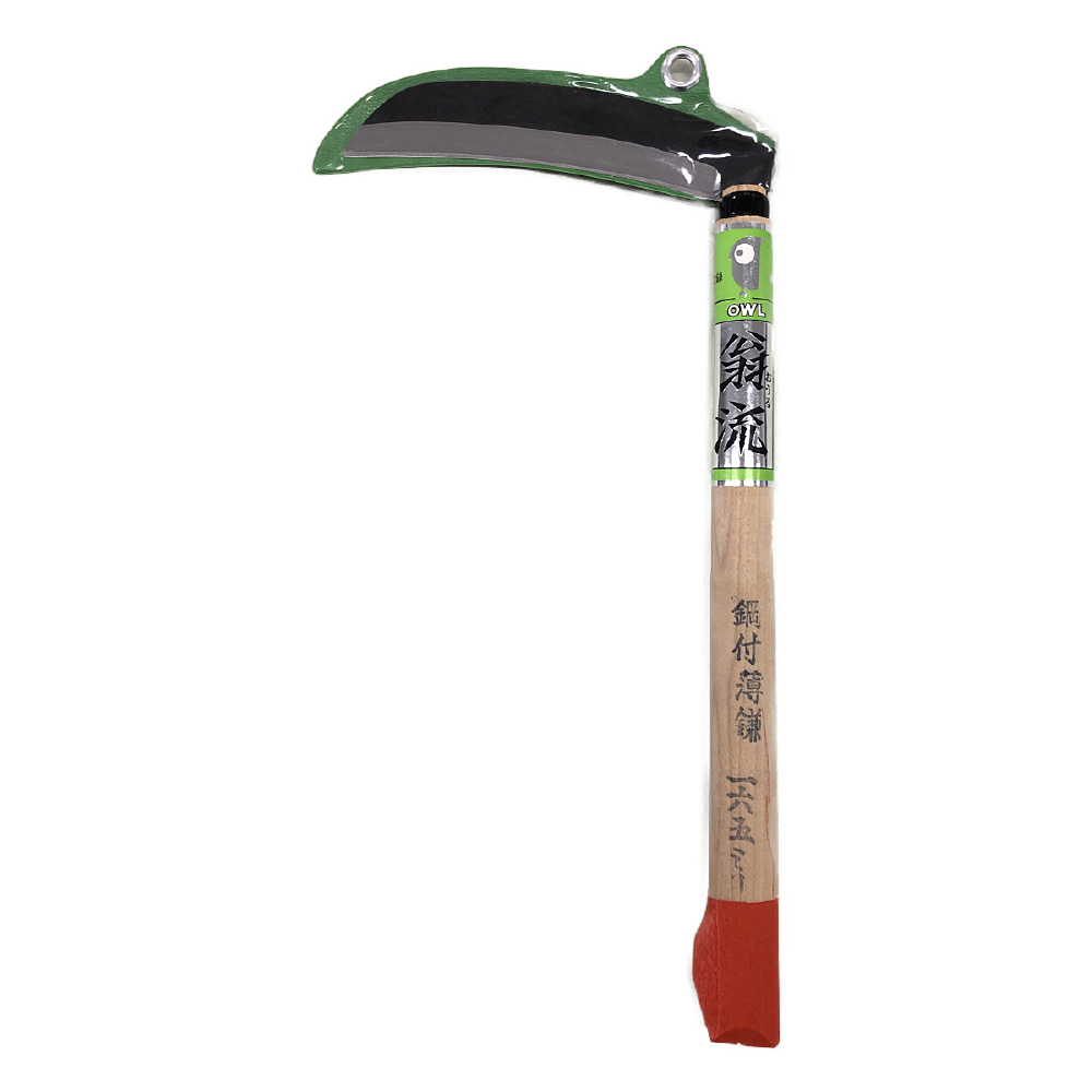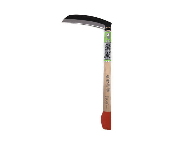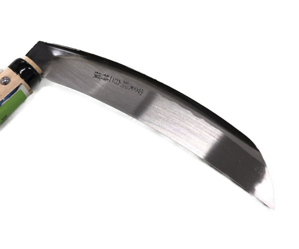 刃部は鋼付きの柔らかい草用の片刃のうす鎌です。鋼付きで切れ味がよく、刃研ぎが出来ます。柄尻にコブを付けて力入りやすく滑り止め効果仕様。