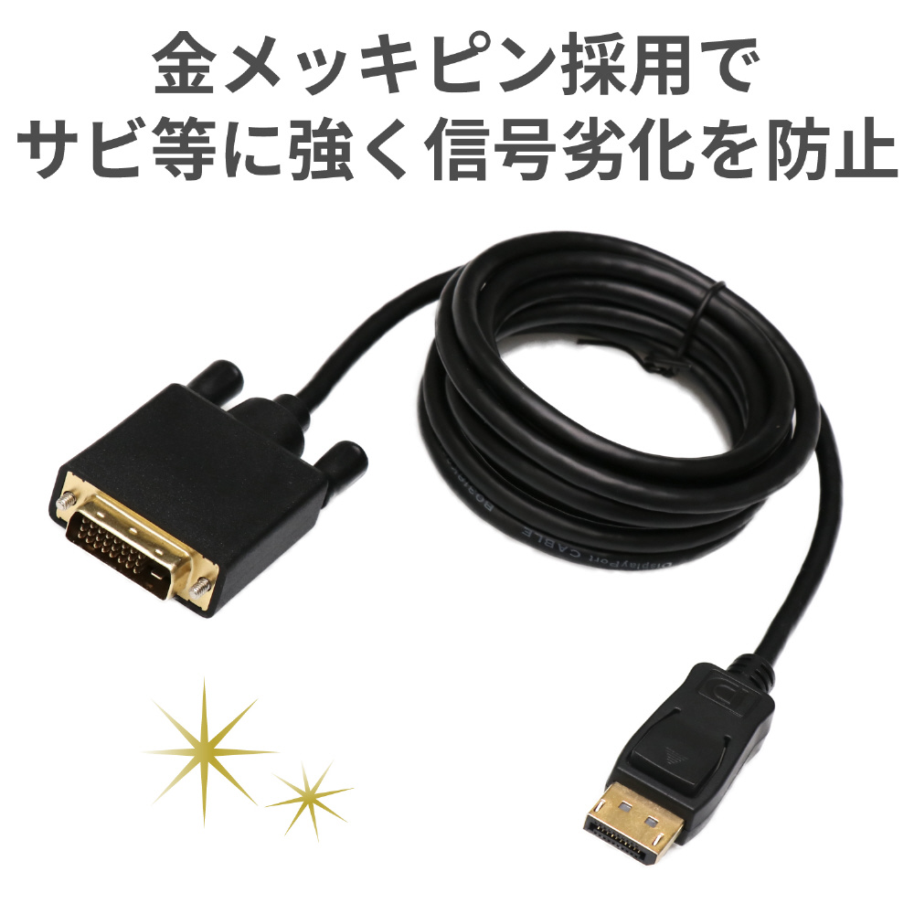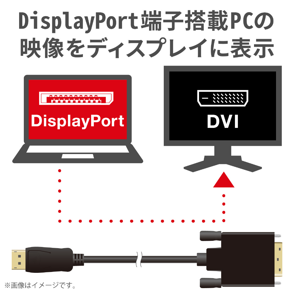 DisplayPort端子を搭載したパソコンの映像信号を変換し、DVI(DVI-D 24pin)入力端子を搭載したディスプレイなどに出力することができる変換ケーブル。