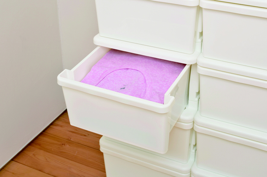 ■収納目安 Yシャツ=約6枚、セーター=約4枚、バスタオル=約4枚 引出し1段あたりの収納目安。