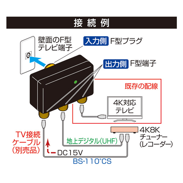 既存の配線に4K8Kチューナー・レコーダーを追加する際に便利な分配プラグです。
