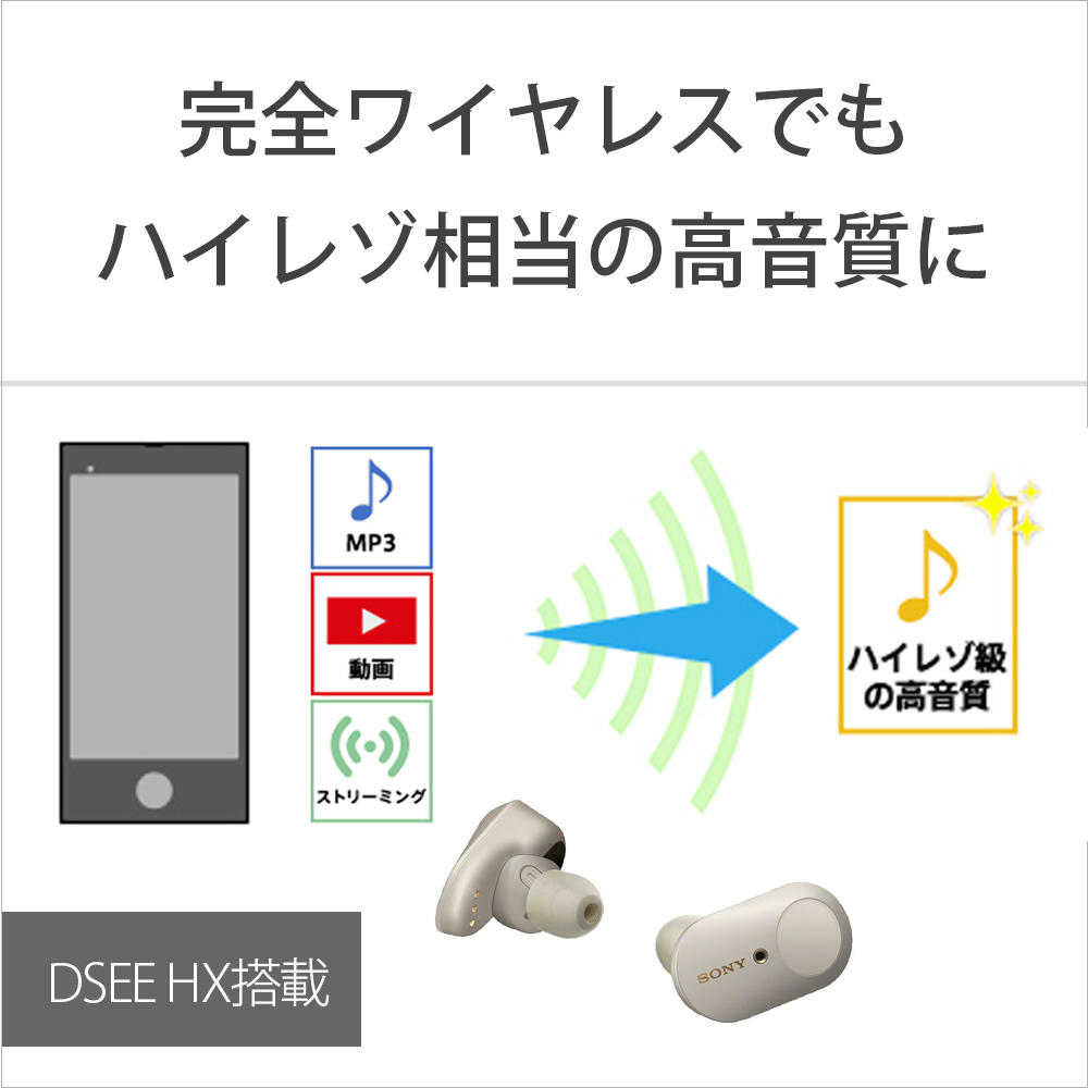CDやMP3などの圧縮音源の高音域を補完し、ハイレゾ相当の高音質を楽しめるDSEE HXを完全ワイヤレスで初搭載。高音質に浸ることができます。
