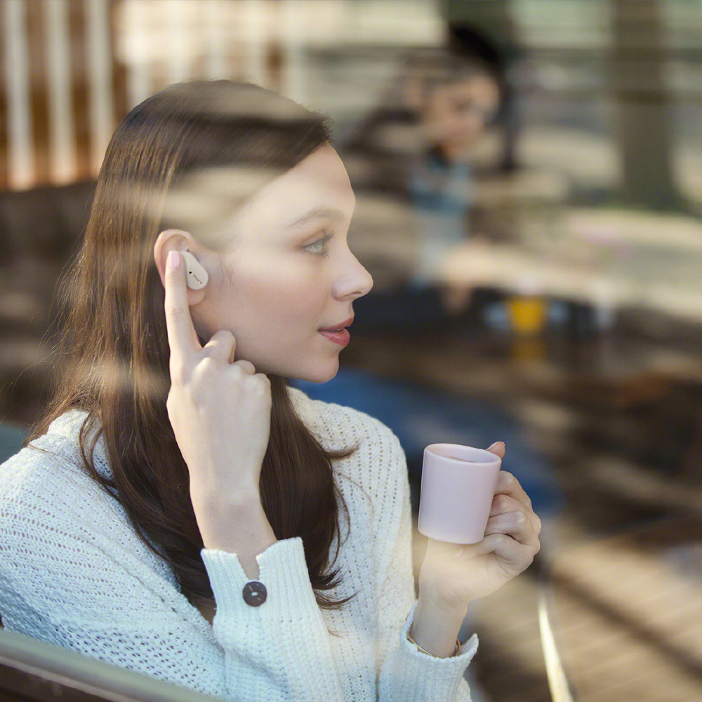 本体に搭載されたタッチセンサーの左側を指で触れている間、一時的に音楽の音量を絞り、周囲の音を取り込んで聞きやすくする機能を完全ワイヤレスに初めて搭載。たとえば、緊急のアナウンス時などに周りの状況をすぐ把握したい場合や、とっさに会話をする際に便利です。