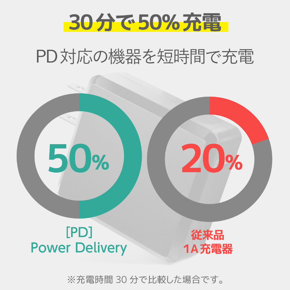 PowerDelivery(18W)に対応し、一般的な5W(5V/1A)充電器の3.6倍※出力による超高速充電が可能。