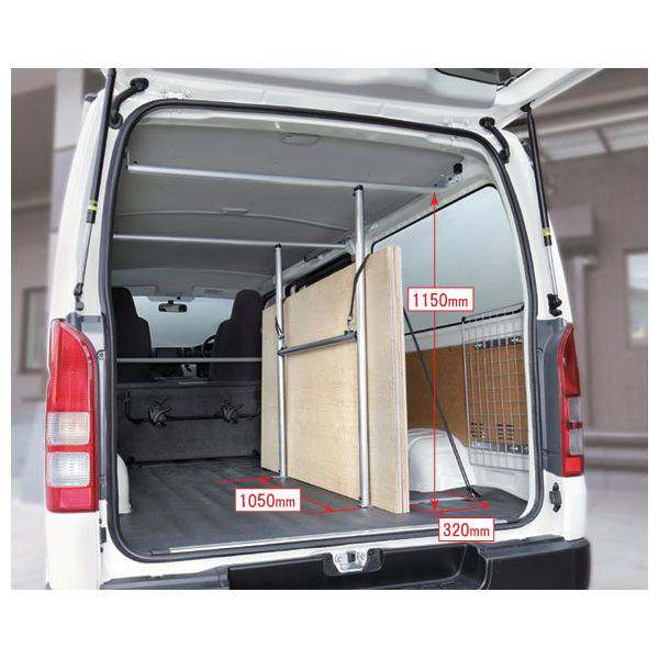 ラゲッジパーテーションを取付ける事でラゲッジスペースを左右に分割することができ、3x6板などをポールに立て掛けて収納できます。