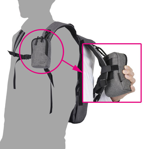 バックパックのショルダーハーネスにカラビナでポーチを固定する際、背面の面ファスナーを留めると揺れを抑えることが可能です。